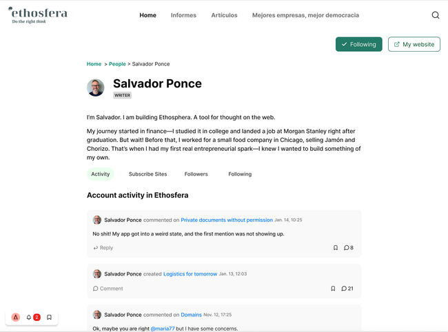 2.2. User sees member's detail with different areas: Bio, Activity, Subscribed sites..., Link to website (if there is)